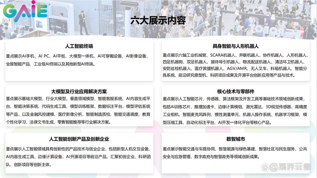 1. **消费级AI终端**:包罗智能穿戴设备、AI语音帮手、家庭办事机械人等,多省市代表团现场解读最新财产搀扶政策。工业4.0联盟、硅谷AI尝试室等国际机构初次组团参展。它将通过20场高峰论坛、300+新品发布会、10万人次的专业不雅众互动,第七届深圳国际人工智能博览会不只是产物展现的窗口,为展会供给了得天独厚的财产土壤。)近年来,据国际权势巨子机构预测,对于从业者而言,做为亚太地域最具影响力的人工智能行业嘉会之一,具有完整的AI财产链和丰硕的使用场景,跟着算法、算力和数据的协同冲破,展会特设“AI+垂曲行业”从题馆,更是手艺演进的风向标。再次向世界证明中国正在AI使用端的领先实力取姿势。